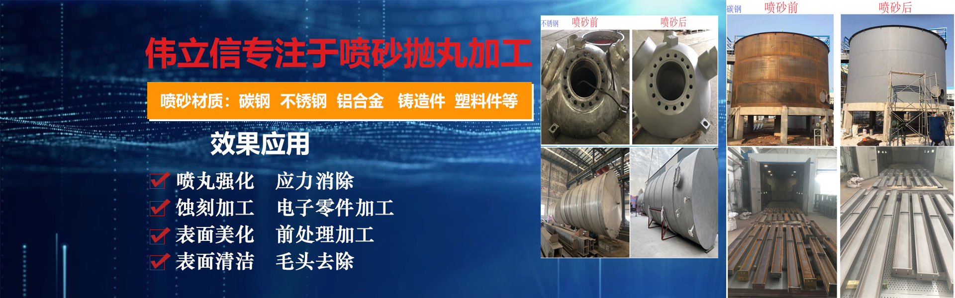 武汉伟立信机械设备有限公司(喷砂热线:18186495283)是一家从事表面涂装和表面清理设备的厂家,公司位于武汉市武昌区。是一家集表面涂装和表面清理设备科研、开发、生产、销售、服务于一体的综合型企业。 公司自创建以来,一直秉持认真、负责的态度,以其科学而严密的管理,先进而不断创新的技术,致力于表面处理设备的研制和开发,主要产品有:手动喷砂机、自动喷砂机、开放式加压喷砂机、干湿式喷砂机及大型喷砂房,抛丸机,除尘设备,另可根据客户要求定做。低价经营各类喷砂磨料:玻璃珠、钢砂、钢丸、不锈钢丸、钢丝切丸···